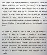 Le «don monétaire». Il permet de faire vivre le musée qui a un petit budget. C’est une aide au financement du musée. Par exemple: un chèque… ou un versement dans la crousille. |